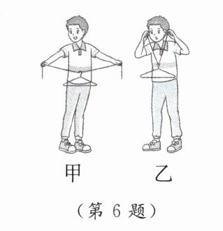 6. 教材活动改编题 如图所示,小明用衣架做了一个听声实验,他将衣架挂在棉线的中央(如图甲所示),请小华用铅笔轻轻敲击衣架,声音通过
