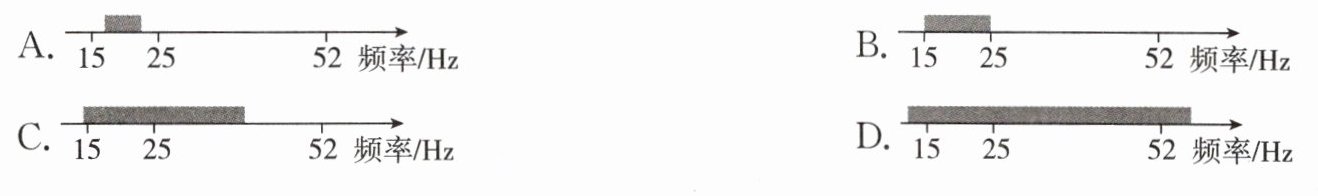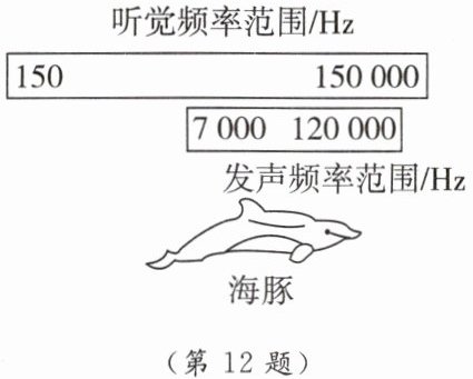 12. 正常灰鲸的发声频率范围为15~25Hz。生物学家发现变异灰鲸Alice的发声频率为52Hz,导致正常灰鲸“听不见”Alice的声音,如图所示为海豚的发声和听觉频率范围,灰鲸与海豚同属海洋哺乳动物。由此推理:正常灰鲸听觉频率范围(灰色横条)很可能是(
