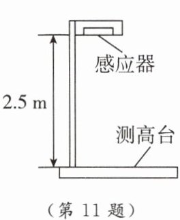 11. 如图所示为一种身高测量仪,其顶部的感应器竖直向下发射超声波信号,经下方物体反射后返回,被感应器接收。某同学站上测高台,感应器记录信号从发射到接收所经历的时间为$5×10⁻^3s。$已知感应器距测高台的高度为2.5m,空气中的声速取340m/s,则该同学的身高为(