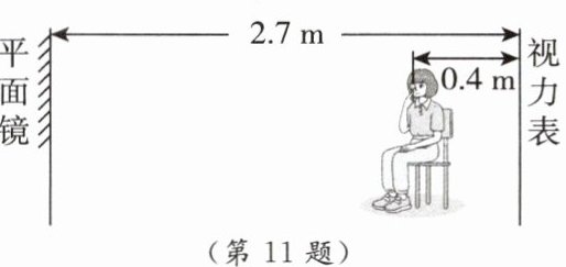 11. [2024·南京建邺区期中] 如图所示,检查视力时,视力表挂在被测者头部的后上方,被测者识别对面墙上镜子里的像。下列说法正确的是 (