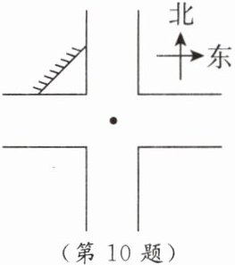 10. 在十字路口矗立着一幢大楼,它临街的一面全部都是用新型玻璃装饰的,因此过往的车辆都在这块大的平面镜中成像,如图所示,小刚在十字路口中心面向北而立,从这面镜子中看到一辆汽车向西行驶,驶到十字路口向左转弯,这辆汽车实际是 (