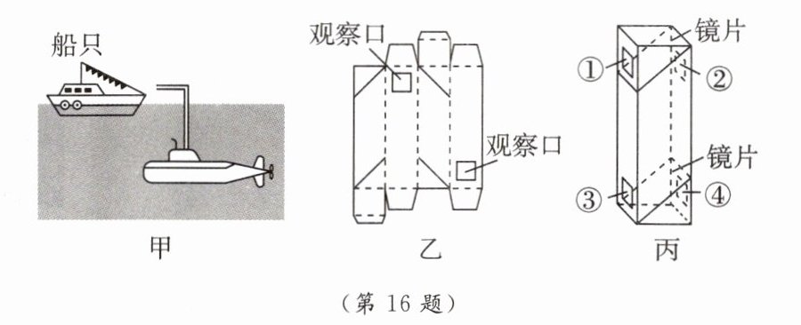 16. [2024·南通通州区期中] 如图甲所示,潜艇中的人利用潜望镜在水下也能观察水面上的情况。利用两块镜片可自制一个简易潜望镜,如图乙、丙所示。