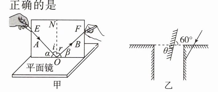 7. 小强同学用如图甲所示的实验装置,探究光的反射定律,并将数据依次记录在下表中。实验后他想让与地平线成60°的太阳光竖直向下照亮井底,他把平面镜按图乙放置。关于上述探究,下列说法正确的是(