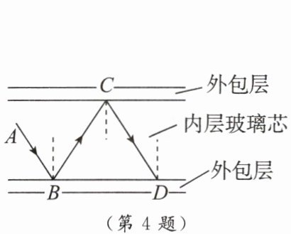 4. 光纤通信中光在玻璃纤维中的传输情况是光每次由内层玻璃芯射向外包层的分界面时,均要发生反射,从而使光在不断地反射中沿内层玻璃芯向远处传播,如图所示,请根据图回答:当增大入射光线AB的入射角时,CD光线的入射角