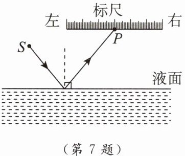 7. 如图所示是一种液面升降监测装置原理图,点光源S发出的一束激光与水平液面成50°角射向平静的液面,下列说法正确的是(