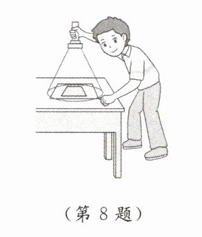 8. 教材图片改编题 晚上,在桌面上铺一张白纸,把一小块平面镜平放在纸上,让手电筒的光正对着平面镜照射,如图所示。此时,从侧面看去白纸比较