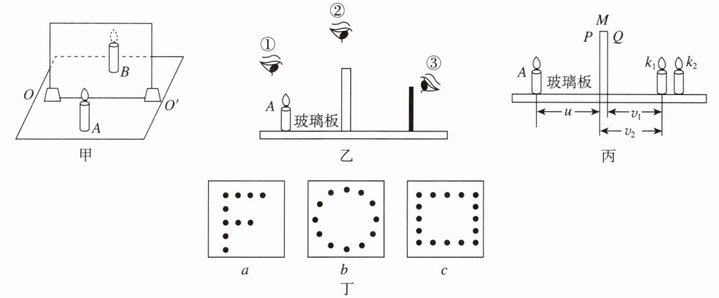 (填“$v_1$”或“$v_2$”)。(5)小明想进一步探究像和物的左右是否对调,他应将蜡烛改成图丁中的
