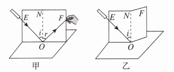 (4)如图乙所示,把纸板$NOF绕ON$向后折,在纸板上看不到反射光。这表明:在反射现象中,反射光线、入射光线和法线在