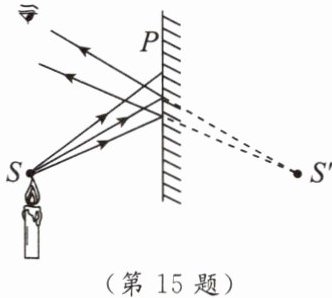 15. [2024·泰兴期末] 如图所示是观察蜡烛在平面镜中成像的光路图,图中$S$是蜡烛的一个发光点,$S'是S$在平面镜中所成的像。请在图中画出入射光线$SP$的反射光线,要求保留作图痕迹。