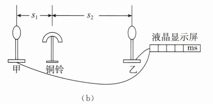ms。(2)一同学想验证声速随传声介质温度升高而增大,把铜铃固定放在如图(b)所示的位置,并与甲、乙在一条直线上,然后打开实验室空调提高室内温度,敲打铜铃,此时他会发现液晶显示屏的数值(