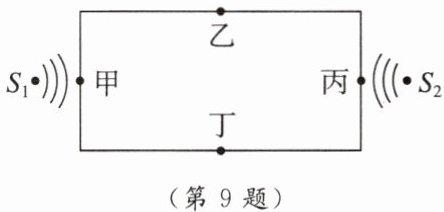 9. [2024·常州金坛区期中]某学校有一个160m×80m大小的操场,广播室在操场两端架起两个音箱$S_1$和$S_2($如图所示),小华绕操场一周试听了一番,在甲、乙、丙、丁四处(它们分别是各边的中点),觉得有两处声音含混不清,则这两处是(