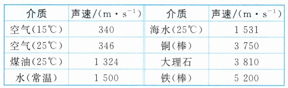 (2) 声音在不同介质中的传播速度不同,一般在固体中传播速度最快,液体次之,气体最慢(如铁(棒)中声速为$5200m/s$,水中常温下为$1500m/s$,空气(25℃)中为$346m/s$)。