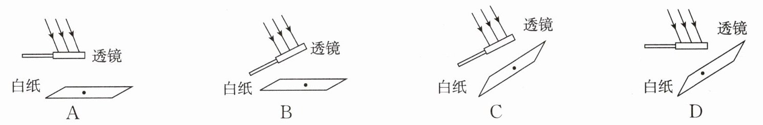 2. 2024·泰州海陵区期中 将凸透镜正对太阳光,其下方的纸上呈现一个并非最小的光斑,如图所示,这时光斑到凸透镜的距离为5 cm。若凸透镜远离纸的过程中光斑一直变大,则该凸透镜的焦距(