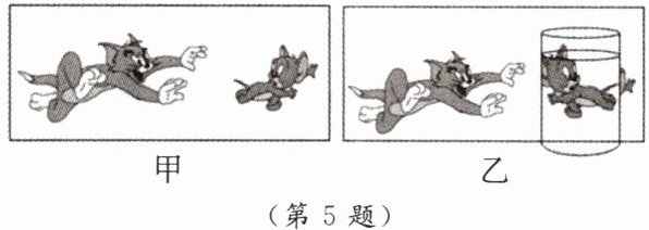 5. 新趋势 真实情境 一幅如图甲所示的漫画立在桌面上。小霞把一个装水的玻璃杯放在漫画前,惊奇地发现:透过水杯看到漫画中的老鼠变“胖”了,还掉头奔向猫,如图乙所示。小霞观察分析:装水的圆柱形玻璃杯横切面中间厚、边缘薄,起到