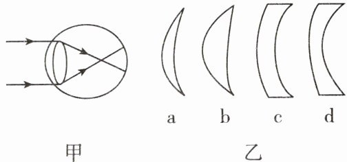 (4)小明仔细观察镜片的形状和厚度,四种镜片的截面如图乙中 a、b、c、d 所示的形状,则可以知道:近视眼配戴度数较大的是____,远视眼配戴度数较大的是____。(均填字母)