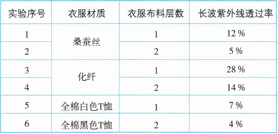 |实验序号|衣服材质|衣服布料层数|长波紫外线透过率|