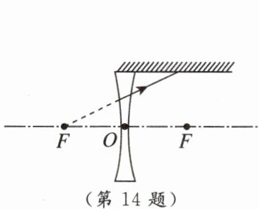 14. [2024·南京秦淮区期中] 如图所示,一条光线经过凹透镜折射后又射到平面镜上,最终出射光线与过凹透镜的主光轴相交于 $ P $ 点。画出这条光线对应的入射光线,并确定出 $ P $ 点的位置,保留必要的作图痕迹。