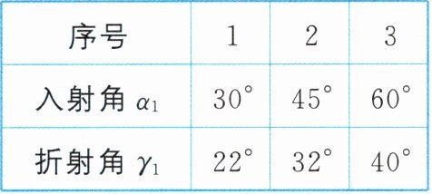 (1)不发生;0° (2)在同一平面内 (3)误把折射光线与界面的夹角看成折射角 (4)①32° ②B (5)把水换成玻璃等透明介质进行多次实验 [点拨](4)①根据光路具有可逆性,结合表一的数据知,入射角是32°,折射角是45°;②在探究“光从空气斜射入水中的折射特点”时,完成了第4次实验,入射角是40°,大于30°,小于45°,故折射角应大于22°,小于32°,故选B。