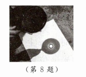 8. 为测量某凸透镜焦距,小芳先在纸上画一个小于透镜大小的圆环,如图所示,将凸透镜正对太阳光,在其下方距透镜8 cm处的白纸上的光斑恰好与圆环重合,这个现象表明凸透镜对光有