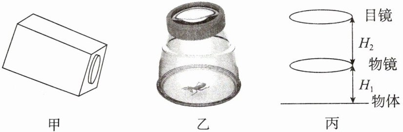 ③若我们用两个相同的凸透镜制作一个简易的显微镜(如图丙所示),需要调整物体与物镜的距离为 $ H_{1} $,物镜与目镜之间的距离为 $ H_{2} $,调整后,$ H_{2} $