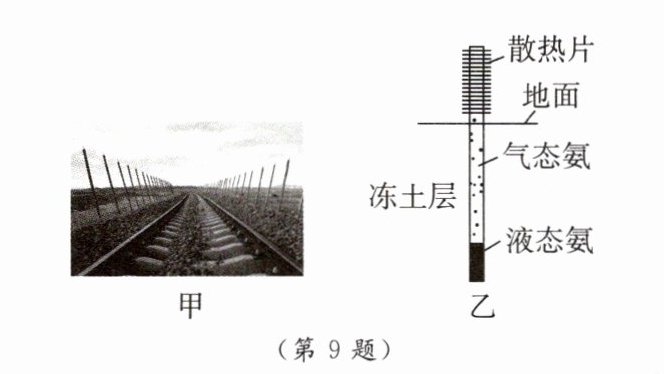 9. [2024·日照期中] 如图甲所示是青藏铁路冻土区路基两侧的“热棒”。图乙是“热棒”的内部示意图,工作时,上端的氨气通过散热片将热量传给空气,发生