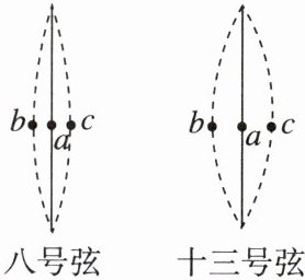 7. [2024·扬州中学月考]分别拨动古筝的八、十三号弦,如图所示,用同一设置的相机拍摄到两弦最左摆到b处,最右摆到c处,静止时在a处。测出每振动880次,八号弦用时2s,十三号弦用时4s,则八号弦(