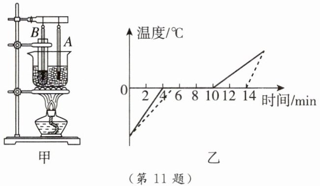 11. [2024·淮安涟水模拟] 在探究“冰熔化时温度变化的规律”实验中,分别在烧杯和试管中放入适量的碎冰,并各放入一支温度计组成如图甲所示的实验装置,其中 $A$、$B$ 两支温度计的示数随时间变化的图像如图乙所示,其中实线部分是