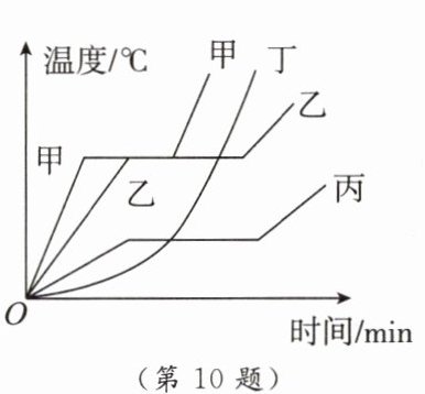 10. 如图所示为甲、乙、丙、丁四种物质在加热条件相同的情况下,熔化过程中温度随时间变化的图像,可以看出,这四种物质中,