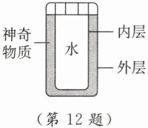 12. 市场上有一种“$55^{\circ}C$ 保温杯”,外层为隔热材料,内层为导热材料,夹层间有“神奇物质”,如图所示。开水倒入杯中数分钟后,水温降为 $55^{\circ}C$ 且能较长时间保持不变。“神奇物质”在 $55^{\circ}C$ 时,下列说法正确的是 (