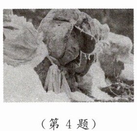 4. [2024·南通海门区月考] 如图所示是某电影中的一幅画面,电影描述的真实历史场景是在零下四十多摄氏度的极端天气下,英勇的志愿军战士有的被冻成“冰雕”,凭着钢铁意志,使敌人节节败退。从战士们口中呼出的水蒸气在眉毛上结了一层厚厚的“霜”,“霜”的形成是