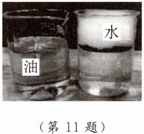 11. [2024·南京玄武区期中] 在家庭实验中,小红做了一些有趣的探究。如图所示,在两只相同的烧杯中倒入体积、温度均相等的食用油和水。将干冰放入油和水中,都会观察到有大量气泡产生,这是因为干冰发生了