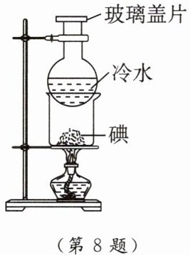 8. [2024·咸阳秦都区月考改编] 如图所示是“探究碘的升华和凝华”实验,当时的环境气压是标准大气压。查阅资料可知:碘的熔点是 113.5℃,沸点是184.4℃,酒精灯火焰的温度约 600℃。实验时观察到以下现象:用酒精灯加热时看到碘蒸气上升,停止加热又能看到烧瓶底部有碘晶体。下列说法中正确的是(