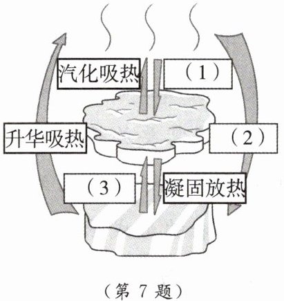 7. 在自然界的水循环中,水的状态可以发生多种变化,并会在状态变化时吸热或放热,小虎在归纳水循环示意图时忘了三个地方没有写全,请你帮他按已整理的格式补充完整。