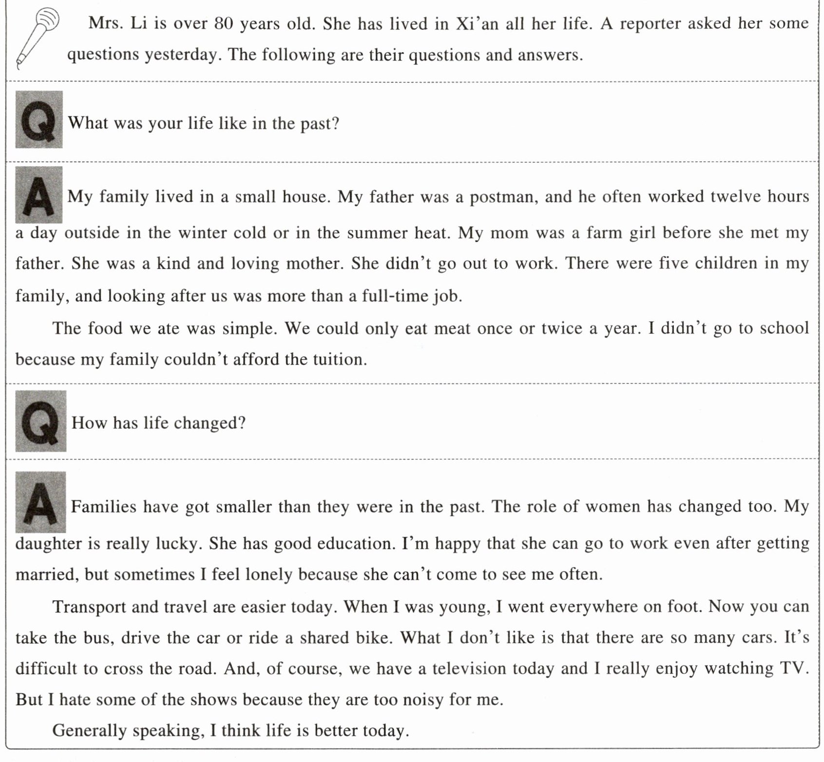 Mrs. Li is over 80 years old. She has lived in Xi’an all her life. A reporter asked her some questions yesterday. The following are their questions and answers.
