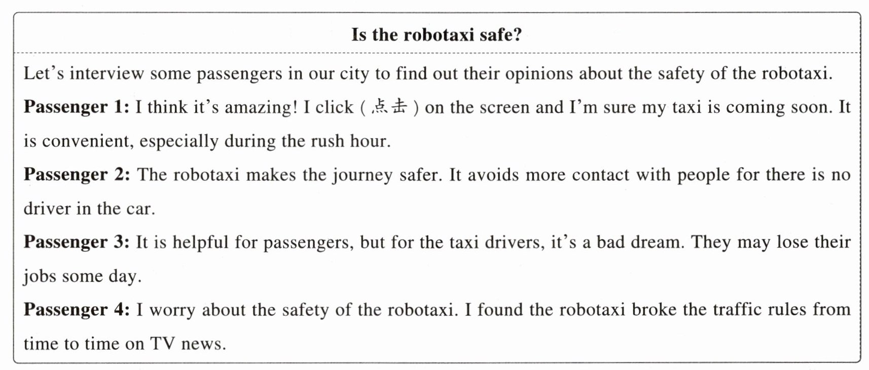 ”.30. What are the advantages and disadvantages of the robotaxi according to the interview of passengers?