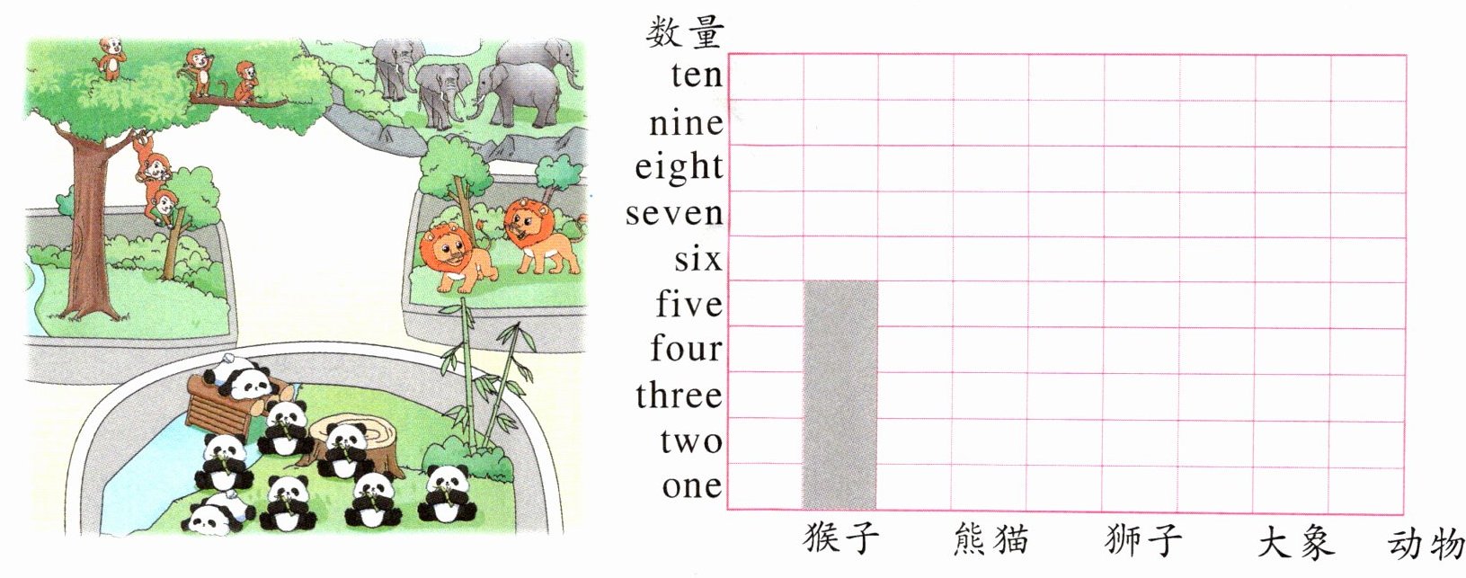 七、新趋势 综合 看图,数一数每种动物的数量,并仿照示例完成条形统计图。
