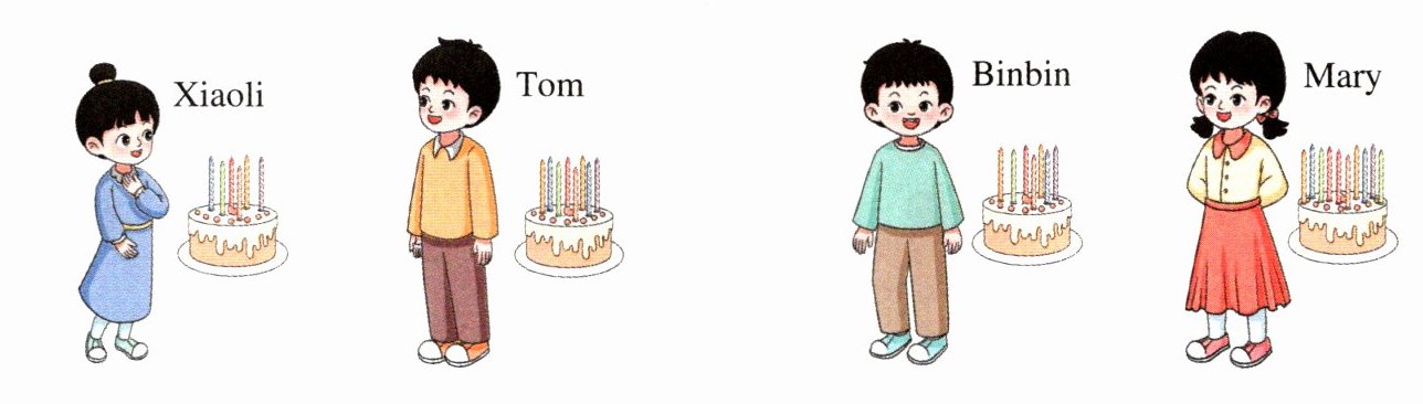 五、学校准备给同一天过生日的同学举办生日会。数一数蛋糕上的蜡烛,选择正确的问句或答语。