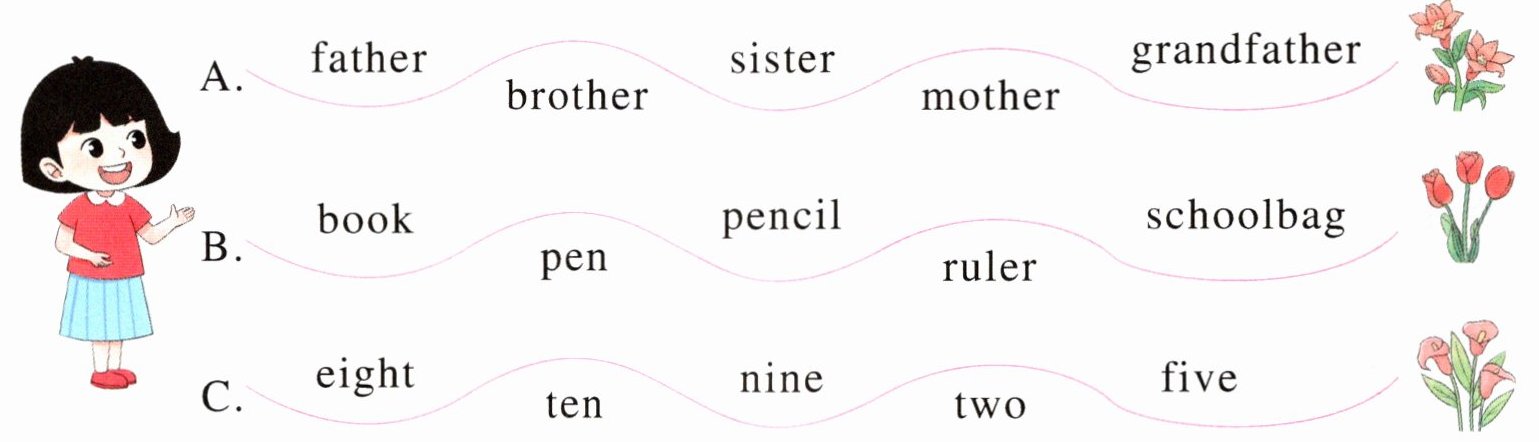 三 趣味题 元元快过生日了,路路想买哪束花送给元元呢?请沿着学习用品类单词的路线走,圈出路路想买的那束花吧!