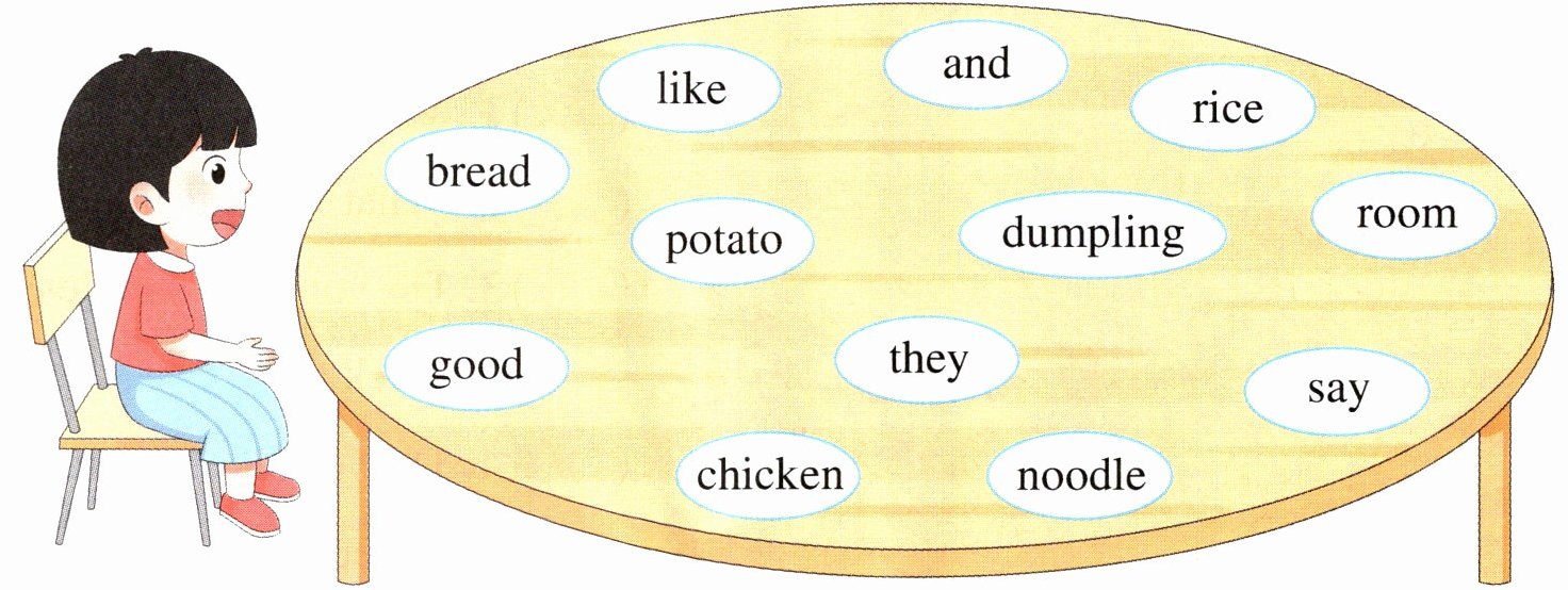 圈出的食物类单词:bread、rice、potato、dumpling、chicken、noodle