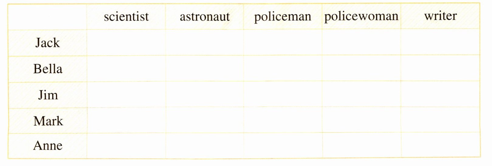 四 通过一天的学习,同学们都有了自己梦想的职业。听录音,在表格相应的栏中打“√”。