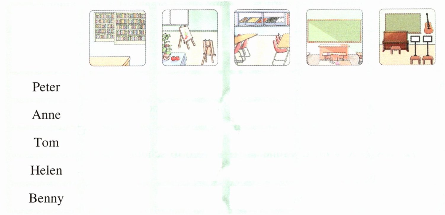 The students are playing hide - and - seek in the school. Where (在哪里) are they? Peter is in the library. Anne is in the classroom. Tom is in the art room. Helen is in the music room. How about Benny? Oh, he is in the canteen. They have