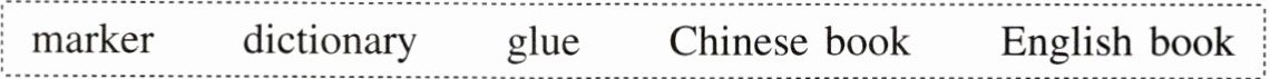 1. glue 2. marker 3. dictionary 4. English book 5. Chinese book