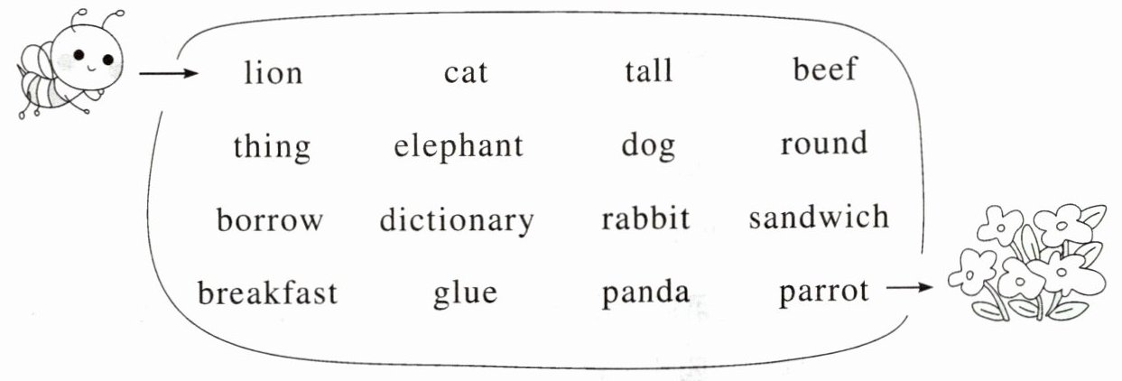 一、沿着“动物单词”的路线,帮小蜜蜂采到花蜜吧。