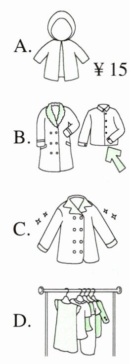 1. I want the big one. 2. Can I have a new jacket? 3. Which one do you want? 4. How much is this raincoat?