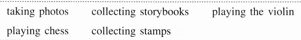 1. playing chess 2. collecting stamps 3. playing the violin 4. taking photos 5. collecting storybooks