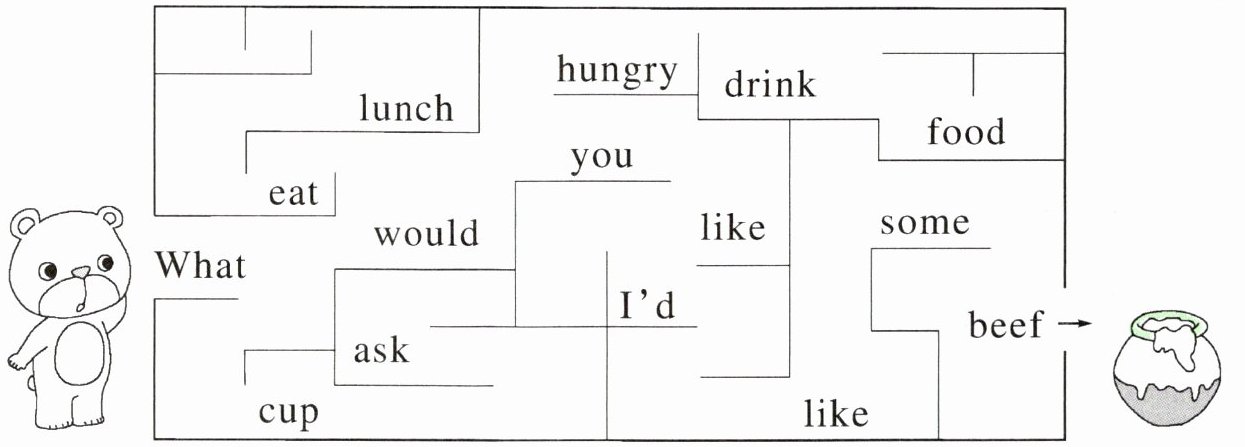 四、走迷宫,找密语,帮小熊找到蜂蜜。(提示:将通关路上遇到的单词连起来组成对话,并写在横线上,注意句首字母大写哦!)