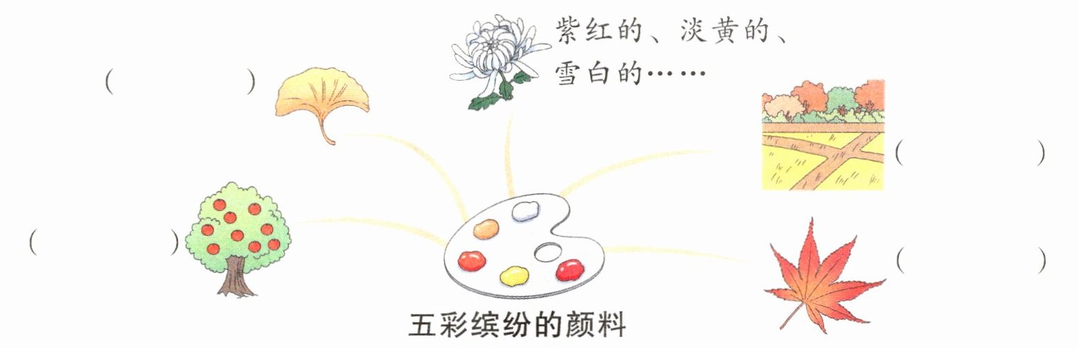 1.(按顺时针排序)橙红色 黄色 金黄色 红色 2.秋天的雨,有一盒五彩缤纷的颜料。 3.人 水果丰收 4.黄黄的叶子像一把把小扇子 红红的枫叶像一枚枚邮票 田野像金色的海洋 示例:紫色 葡萄 紫莹莹的葡萄像一串串透亮的紫珍珠,摇啊摇啊,摇来了阵阵甜香