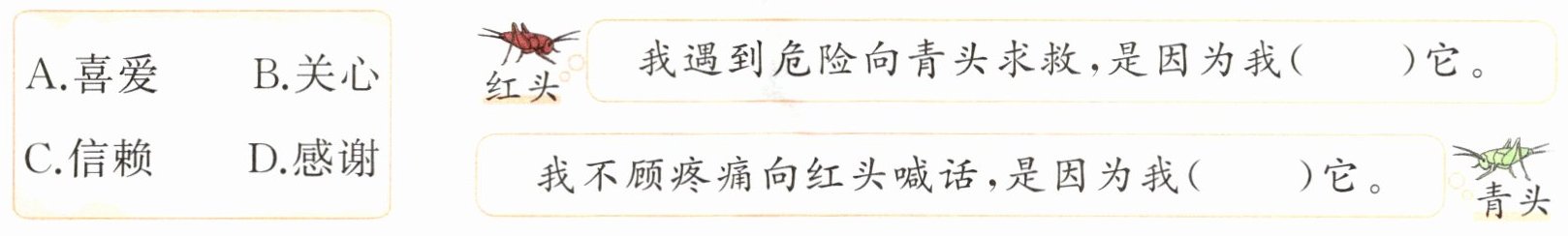 3.体会红头和青头之间的友谊,选择恰当的词语把它们的对话补充完整。(填序号)