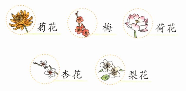 1.梅 2.荷花 3.梨花 4.菊花 5.杏花
