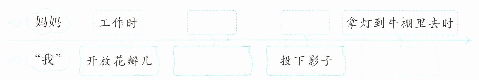 ①散发花香 ②吃过中饭读书时 ③求讲故事 ④沐浴后走到小庭院时